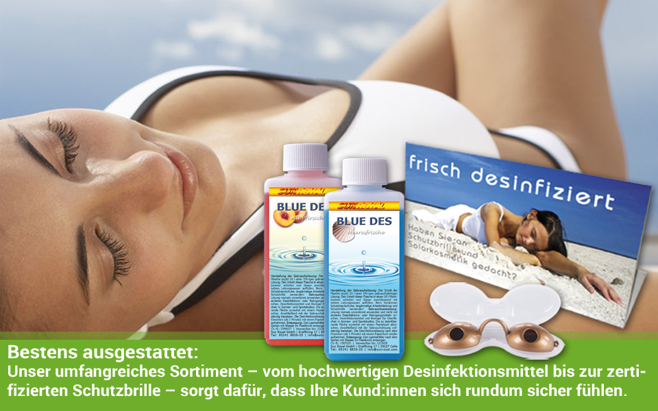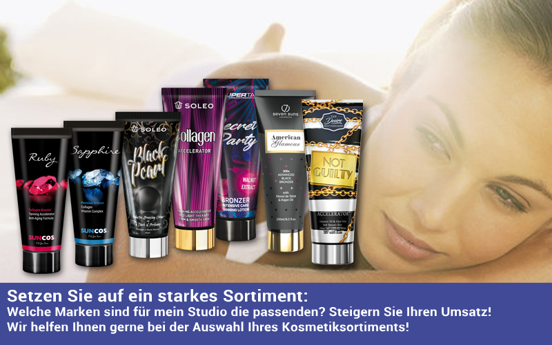 Doch damit nicht genug: Unser Sortiment umfasst sämtliche Produktgruppen, die für einen professionellen Besonnungsbetrieb unerlässlich sind – von UV-Lampen und Hochdruckstrahlern über Solarkosmetik, Desinfektionsmittel und Schutzbrillen bis hin zu Aromadüften, Werbemittelunterstützung und vielem mehr.